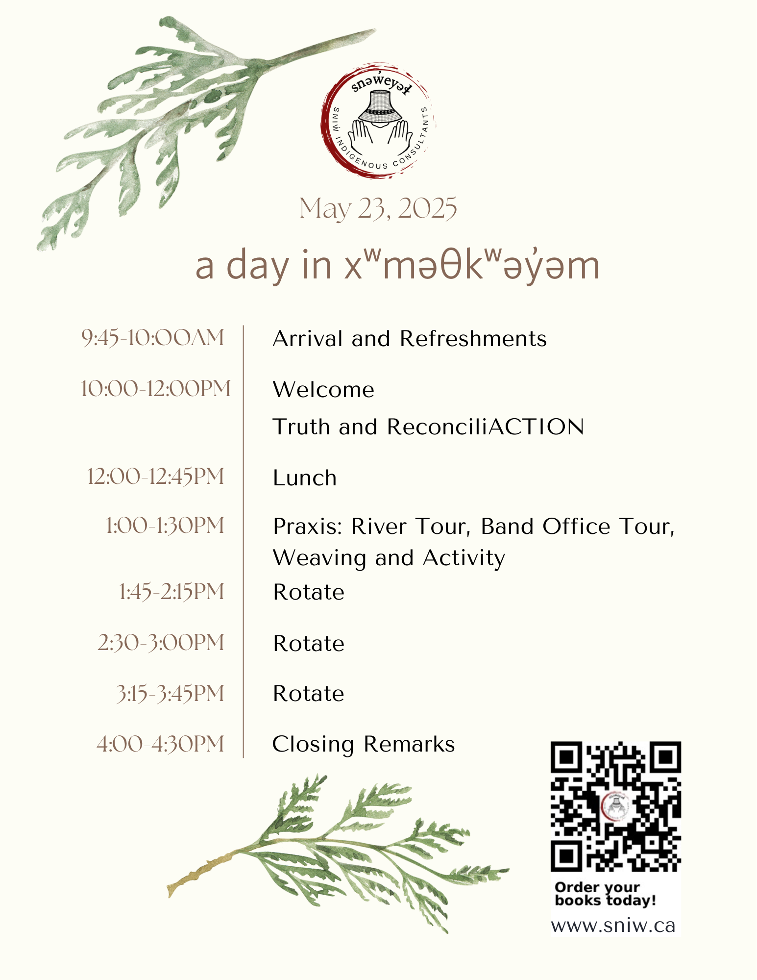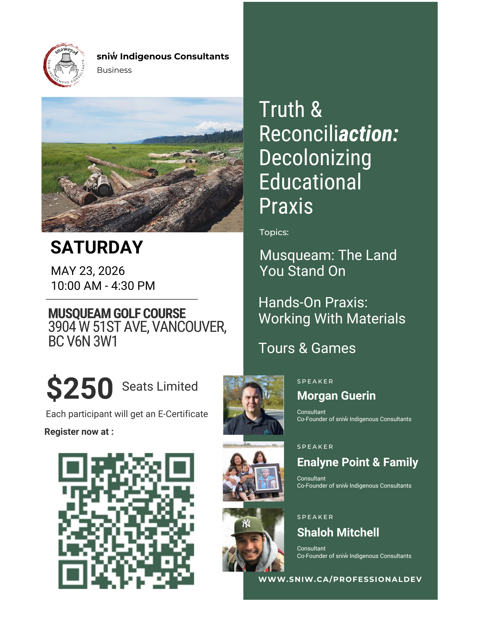 Truth & Reconciliaction: Decolonizing Educational Praxis Join us for a day of Indigenous perspectives, truth-sitting, and hands on praxis sharing with materials and resources. Journey with us as we decolonize a path towards Truth & Reconciliaction. On the Musqueam Reserve, you will gain experiences from speakers, to games and tours. Registration is open from March 13- May 8, 2026